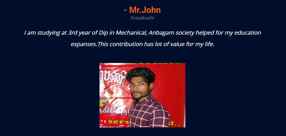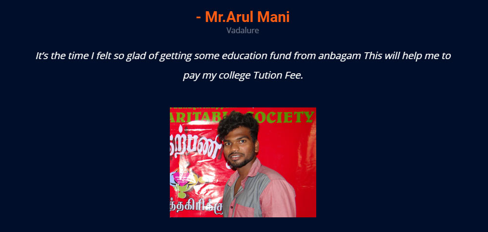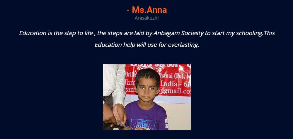 Anbagam Society intends to pursue excellence beyond compliance through extending a generous arm towards those suffering in the world around us.